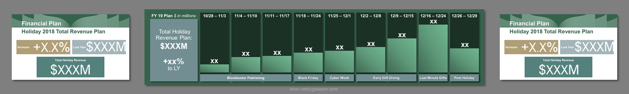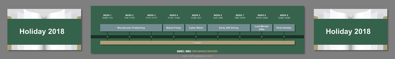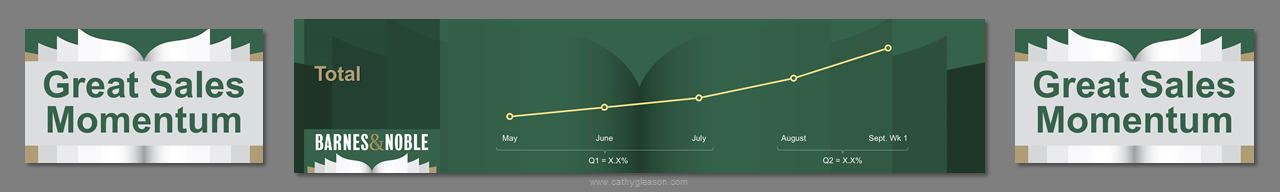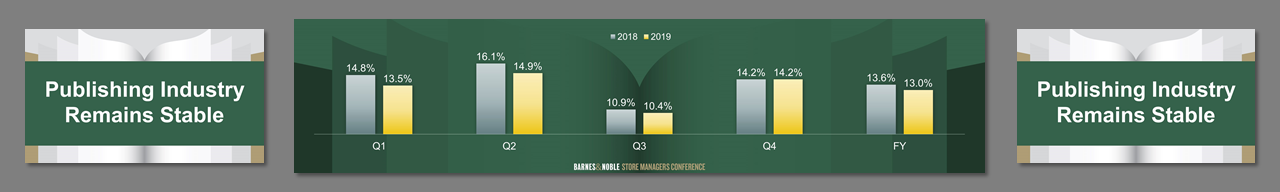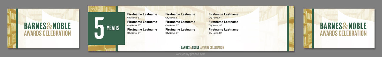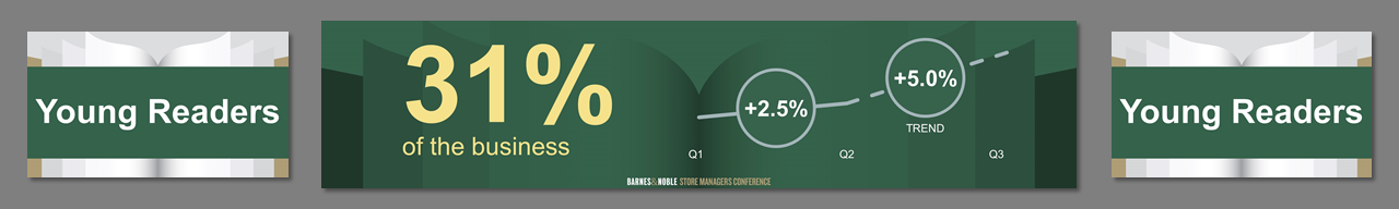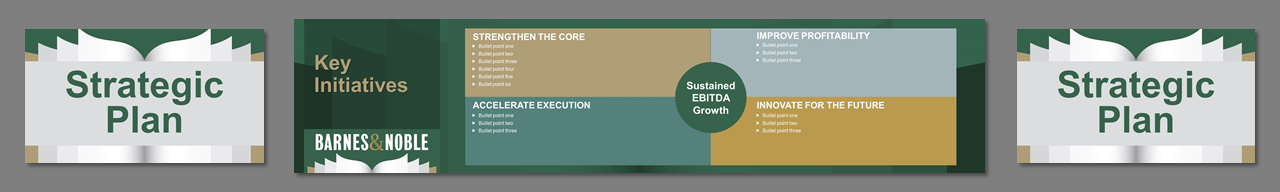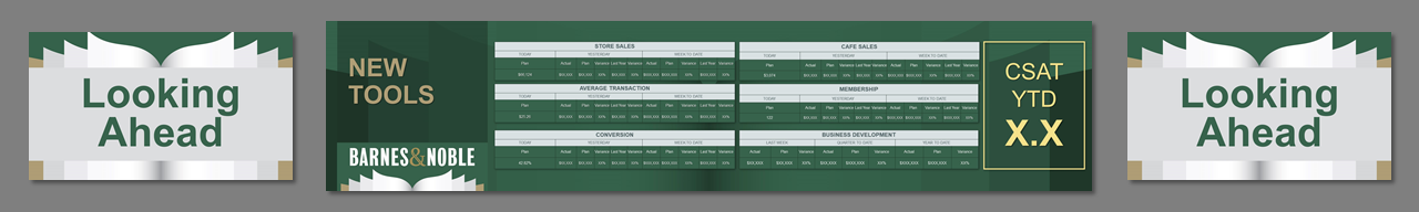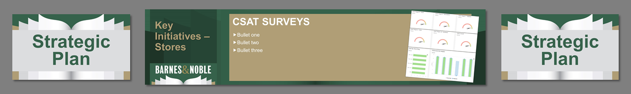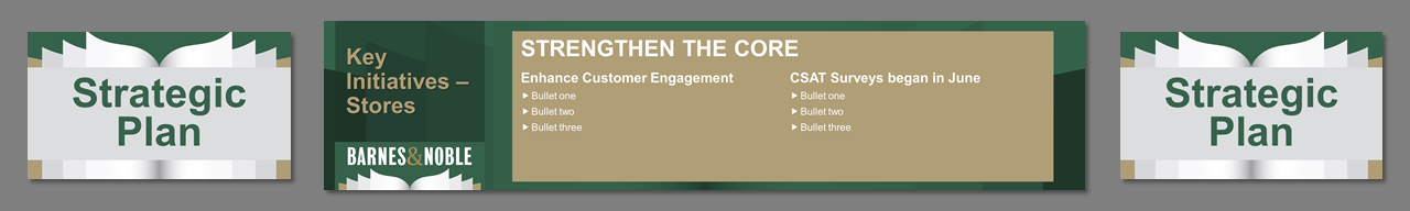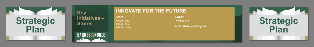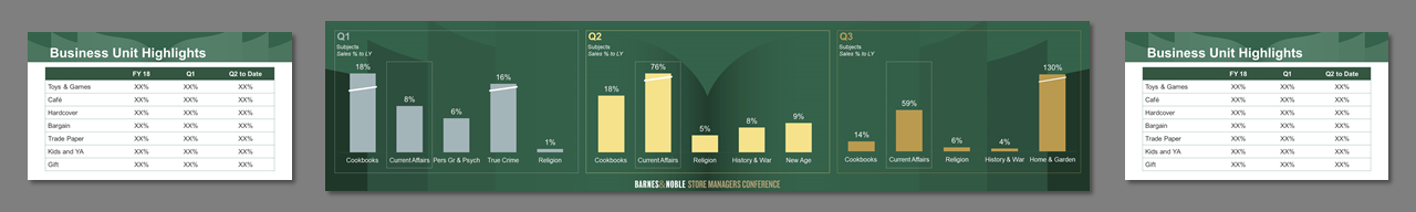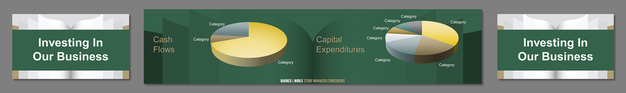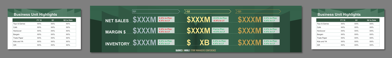 3 screens, center independent from sides. Created template from B&N corporate branding. Worked on all PowerPoint for a 4 day event. Storyboarded speeches, created slides, worked at B&N Corporate offices with the management teams to rehearse, make edits, and fine tune content. Traveled onsite, rehearsed presenters, made edits, ran show computers.